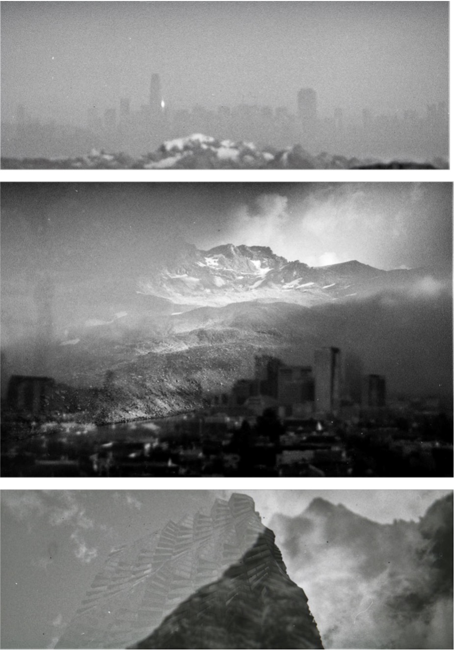 The process of multiple exposures can also achieve a long distance between locations (any location on Earth) and a long time (months, years, decades) between exposures, as shown in the following series SFxCH (2020–2022). In this series I superimposed the striated space of the city with the smooth space of the high alpine, in order to develop a deterritorialized perception.